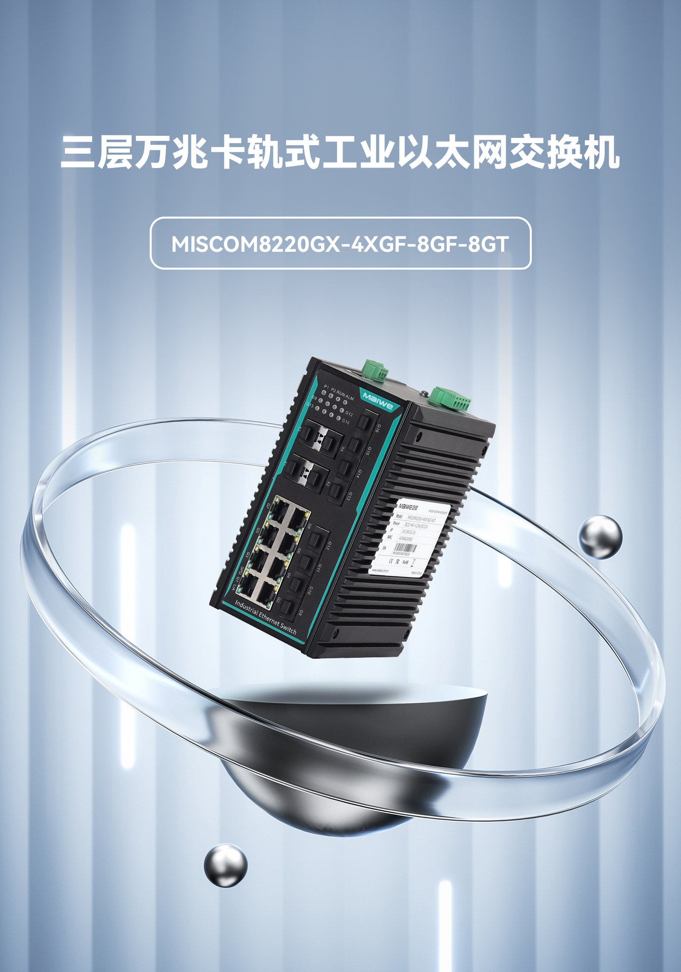 【今日主角】三层万兆卡轨式交换机MISCOM8220GX-4XGF-8GF-8GT 【关键词】强三层、高带宽、小体积、多接口、低功耗、IP40高效散热、EMC 4级