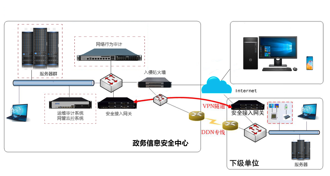 政务网络信息安全方案通过集智达网闸、防火墙、IPS、IDS、网络行为审计、Web应用防火墙、数据库及业务审计等可信安全产品,共同构建出了一个固若金汤的可信网络信息安全体系。